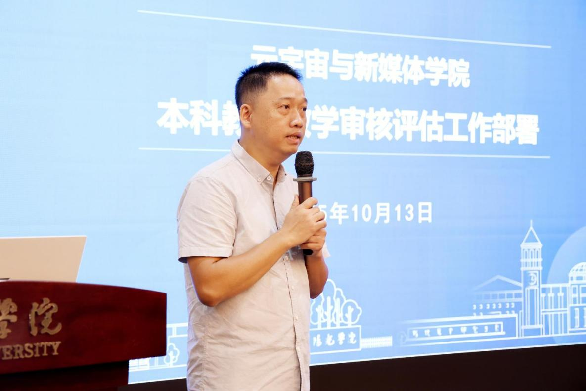 会上,院长池灵达对《元宇宙与新媒体学院本科教育教学审核评估自评报告》作了深入解读。他全面阐述了学院在落实立德树人根本任务、深化教育教学改革方面所取得的阶段性成效,系统梳理了学院在学科融合、课程建设与实践教学等方面形成的办学特色与育人亮点,客观剖析了当前存在的问题与薄弱环节,使全院教职工对迎评工作的目标与要求有了全局性把握。